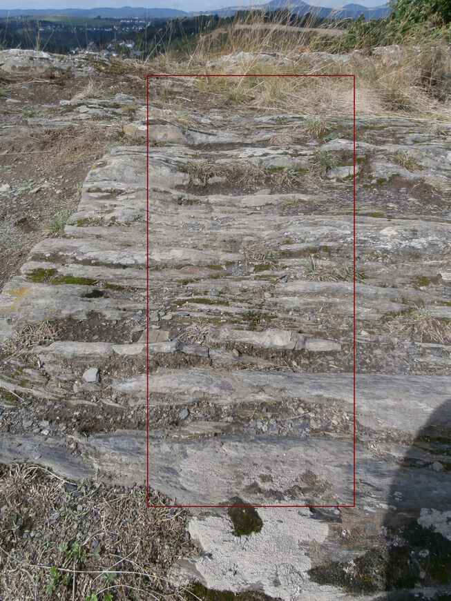 Hier gut zu erkennen der Übergang des Felsens von einer Rundung in eine Gerade. In der Geraden dann wiederrum zu Erkennen die Bearbeitung durch Hammer und Meissel. Hier die Meisseleinschläge. Zwischem dem 1. und 2. Hügel, bei dem Aufgang, sehen sie eine leichte U – Form im Fels.