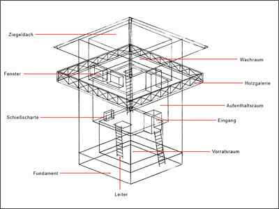 Die Wachtürme bestanden wahrscheinlich aus drei Stockwerken. Im Untergeschoß war ein Abstell- und Vorratsraum, im ersten Stock die Wohnräume und im Obergeschoß der Aussichtsraum.