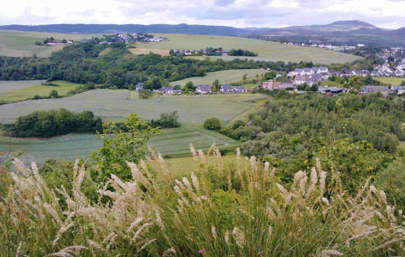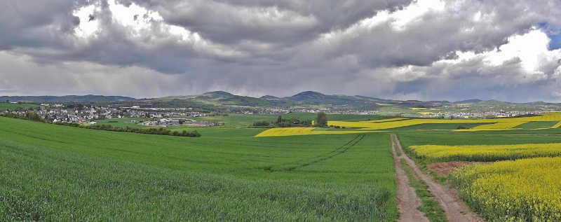 Nun geht es abwärts zur L 113, über die Straße, entlang des Neubaugebietes „Im Leimstück“. Aufstieg zum Burberg mit herrlicher Aussicht.