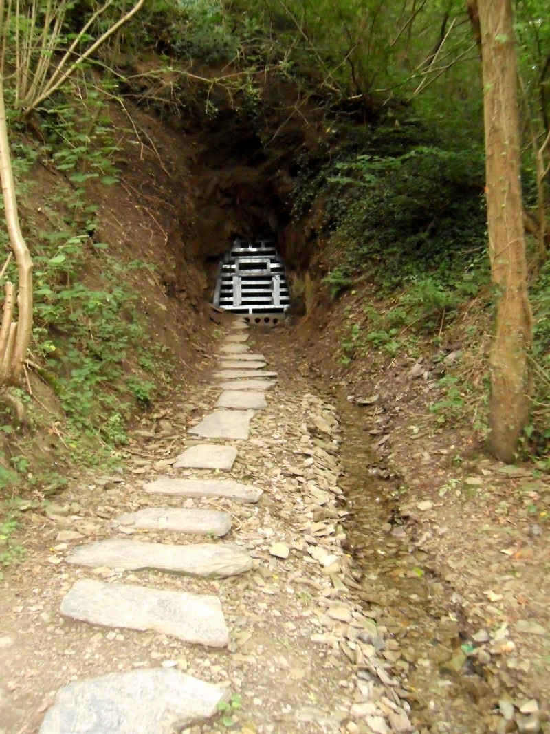 In der „Schlucht“ angekommen, sieht man zwei kleine Bäche zusammenfließen. Beide kommen aus der Grube Margareta. Der linke ist völlig zugeschüttet. Er wurde vom Frondienstagsclub Trimbs in mühevoller Handarbeit wieder freigelegt.