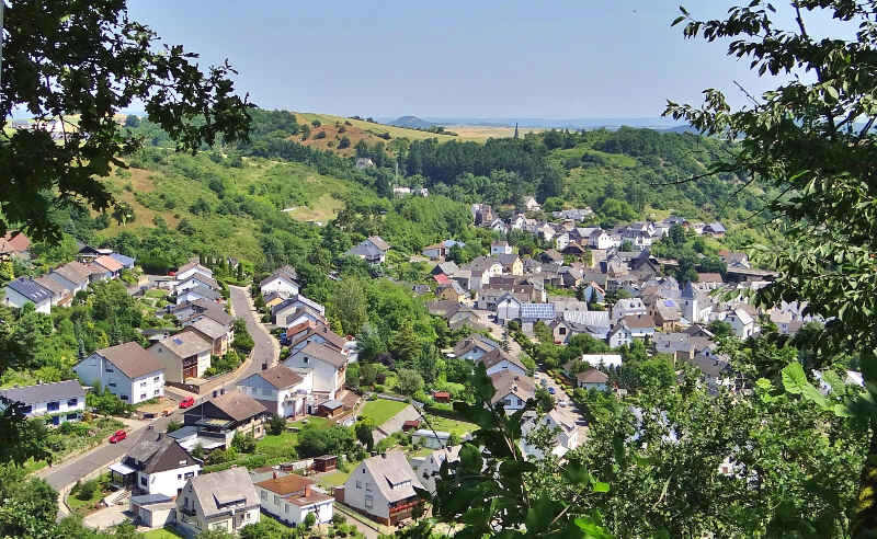 Nun führt der Weg weiter entlang des Neubaugebietes „Im Leimstück“ hinauf zum Burberg (252 m) Hier erwartet Sie ein herrlicher Rund- und Weitblick über Mayen, zur Nürburg, nach St. Johann, Kottenheim, Ettringen, Thür, Mendig und zum Krufter Ofen (462 m) (dahinter liegt der Laacher See). Nicht zu vergessen natürlich die Erhebungen Scheidkopf (527 m), Hochsimmer (588 m), Hochstein (562 m), Gänsehals (515 m) und Thelenberg (400 m).